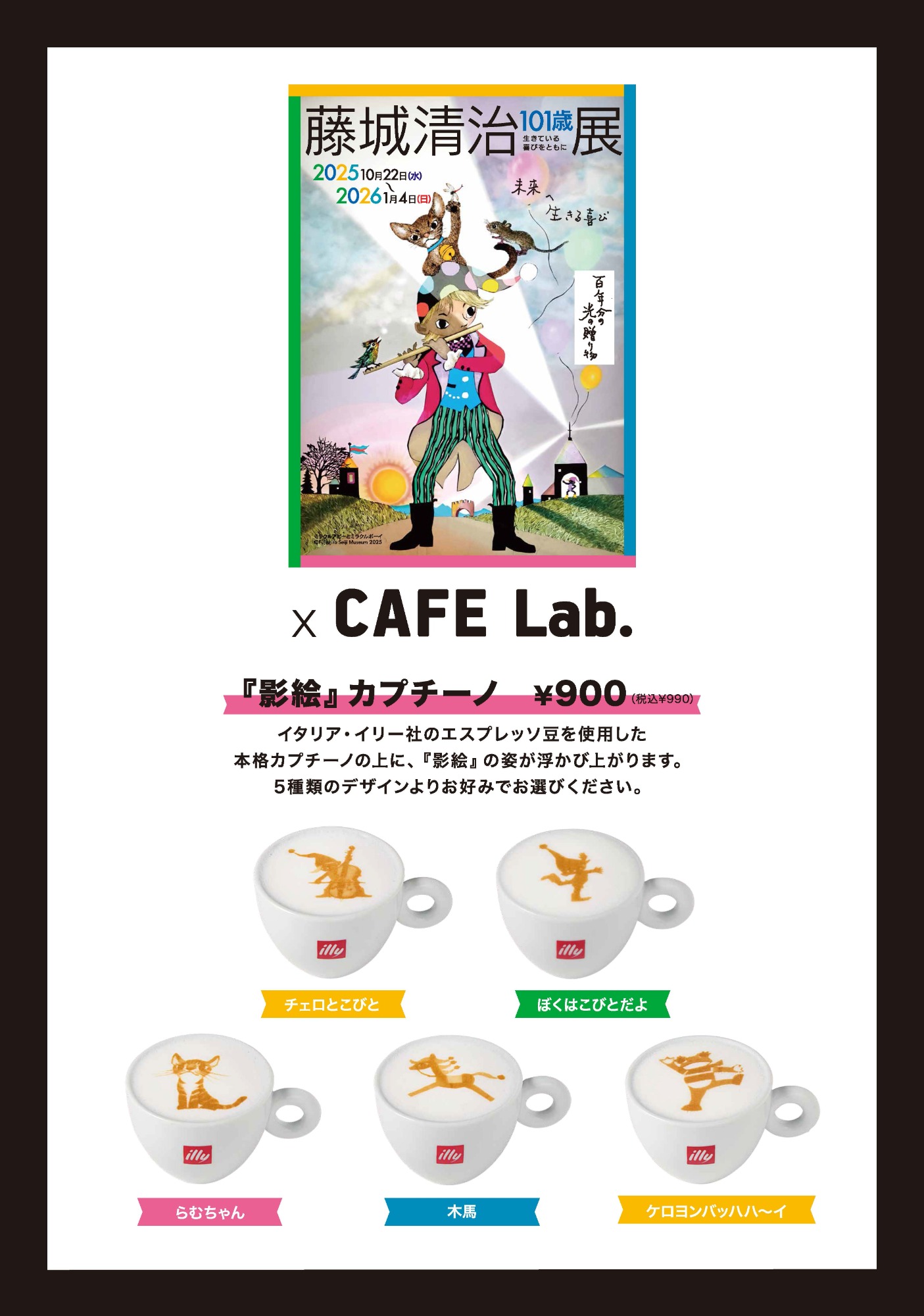 展覧会開催期間中、会場入口に隣接するカフェラボでは、藤城清治さんの影絵作品のキャラクターを描いたカプチーノを販売しています。
