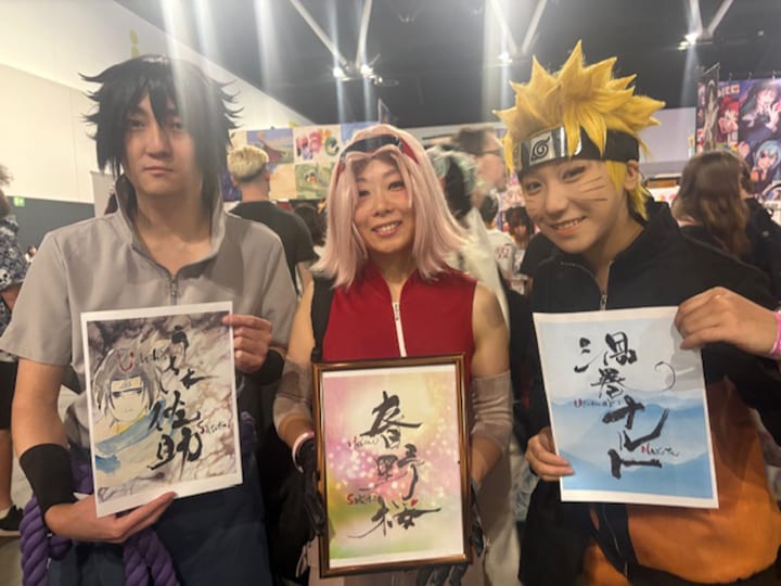 しかし、、、何よりも人気を集めたのは、その場で筆文字で作品を仕上げる「筆文字ライブ制作」でした。来場者の名前を漢字で表現したり、オリジナルのネームタグに文字を即興で書き上げたりするパフォーマンスには、多くの人が足を止め、完成の瞬間を見守ってくれました。自分の名前が筆文字として形になる体験は特別なようで、日本のアニメと同じくらい日本の書道(漢字)もオーストラリアの人達にとっては人気があるのだと思うと嬉しかったです。(人気の規模は違いますが笑)