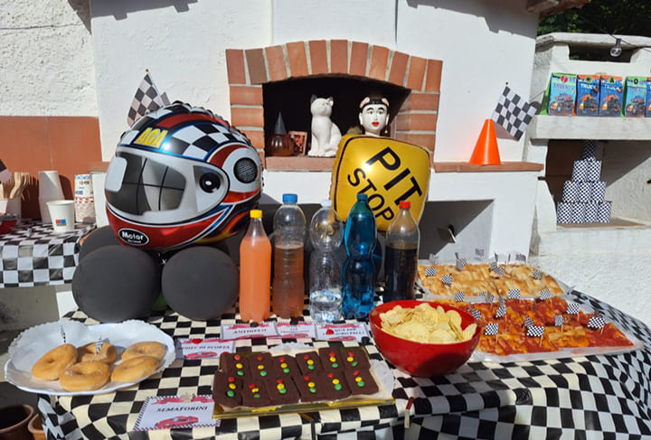 料理はというと、会場に着くと、テーブルには必ず定番のバースデー・ビュッフェが用意されています。フォカッチャやカットされたピザ、ポテトチップス、ハムやサラミを挟んだミニサンドイッチ(ヌテラを塗った甘いタイプも)、タルト、ドーナツ、フルーツジュース、水や炭酸飲料などが並びます。