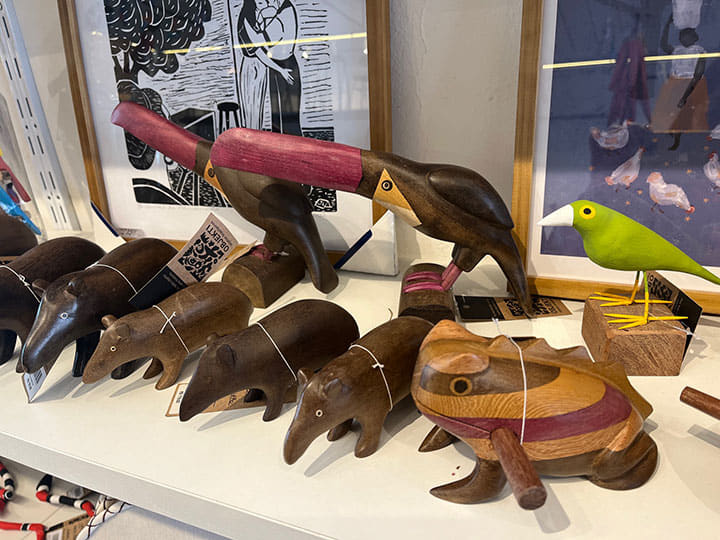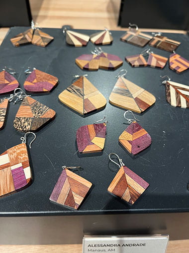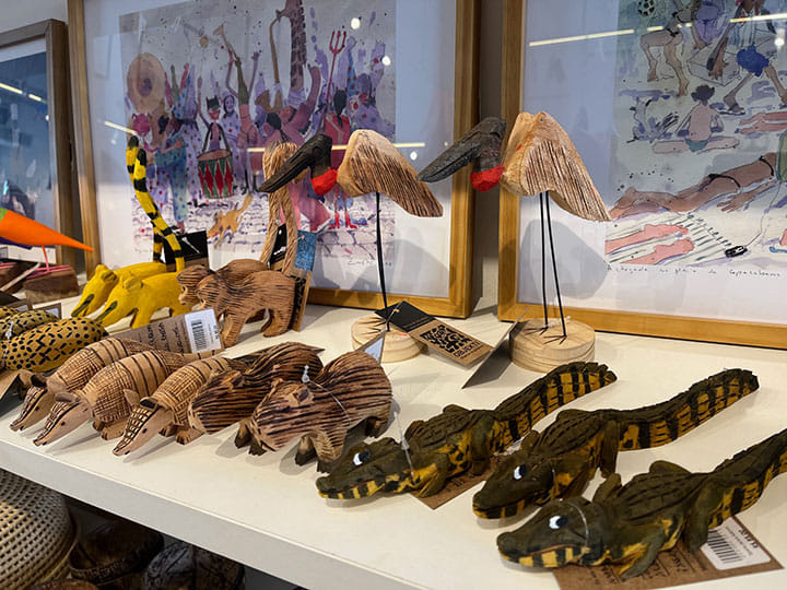 木材で作成された動物のオブジェやアクセサリー、アクセサリー入れなどです。大雨の時期にアマゾンではたくさんの木が倒れます。その木材で隣のパラ州でいろんなオブジェを作成しています。同じ木でも色のトーンが違ったり、薄茶色から赤色までいろんな色の木があるので、シンプルですが、木材の色を活かしたデザインの品があります。