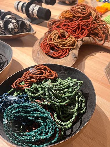 種で作成したブレスレットやネックレスも多くあります。デザインの多くはインディアンの影響が大きいです。インディアンにとって種は命の増殖と言う意味があり、とても大切に使われているそうです。特にアクセサリーに使用されている種がアサイ、ブリチ、ジャリナなどです。最近お店で見つけたのは、モロトトという木の種で作成されたネックレスでした。