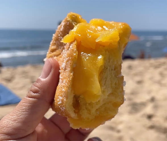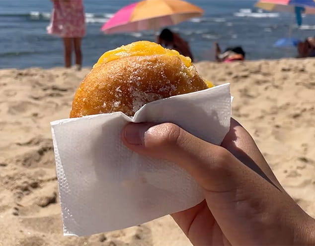 海に入ったあとは体に塩がつき、口の中にも塩気を感じます。その時に食べるボーラ・デ・ベルリンの甘さは、塩気と絶妙なコントラストを生み出し、より強い満足感を与えてくれるのです。しかも、揚げ菓子でありながら生地はふわっと軽く、パサつかないため喉も乾きにくく、砂浜で食べるには理想的。こうして「夏の海辺といえばボーラ・デ・ベルリン」という習慣が根づいていきました。