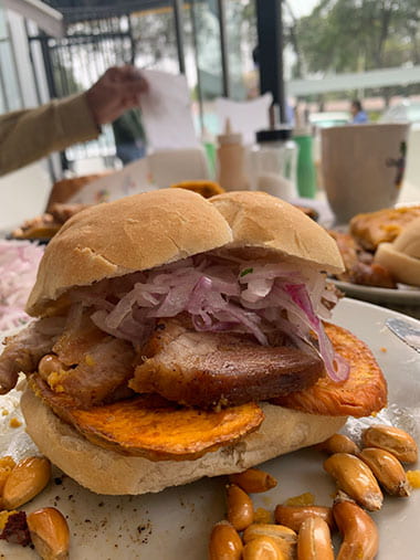 この組み合わせが絶妙で、ジューシーで香ばしい豚肉のうま味に、ほんのり甘いサツマイモがやさしく寄り添い、シャキッとした玉ねぎの酸味が全体を引き締めます。パンは軽めのものが多く、チチャロンの油分をしっかりと受け止めてくれるので、朝からでもぺろりと食べられてしまいます。