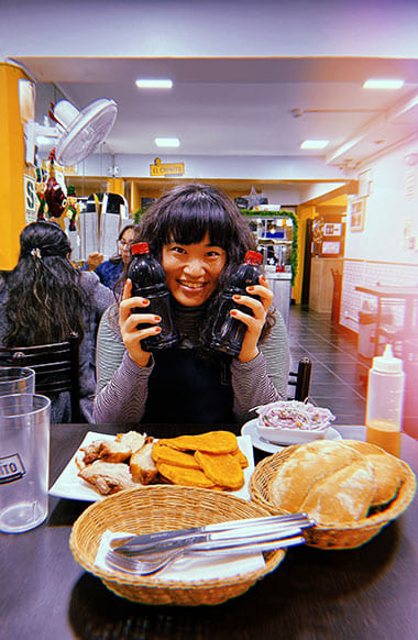 パン・コン・チチャロンには、ペルーならではの飲み物がぴったりで、おすすめしたいのが紫トウモロコシから作られるジュース「チチャモラーダ」。さっぱりとしていて、ほんのりシナモン風味。脂のある料理との相性は抜群でぐびぐび飲んでしまいます。