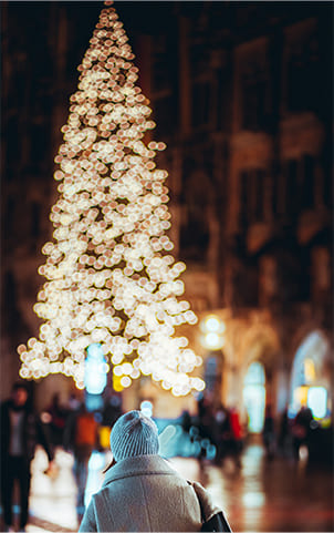 ドゥオーモ広場に立つツリーは、高さ29メートルと聞くと圧倒されるのですが、実際に目の前にすると割と落ち着いた印象のツリー。白を基調にした装飾とやわらかく灯る光は、華やかさや自己主張をするというより、大聖堂と静かに並んで「見てほしい」というより「ここにあります」と言っているような佇まい。