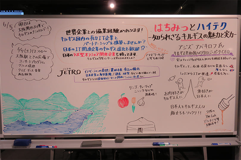 キルギスは中央アジアのスイスとも呼ばれ、観光資源が豊富な場所なのでぜひ足を運んでみていただけたらと呼びかけられた。最後に、今後もハイテクパークやナレッジキャピタルと協力して、キルギスと日本間のビジネス支援を行っていきたいと締めくくられた。