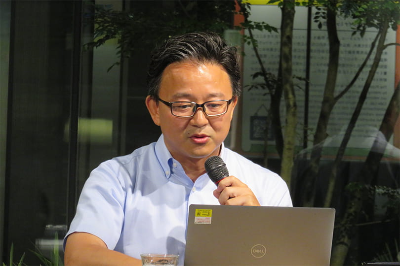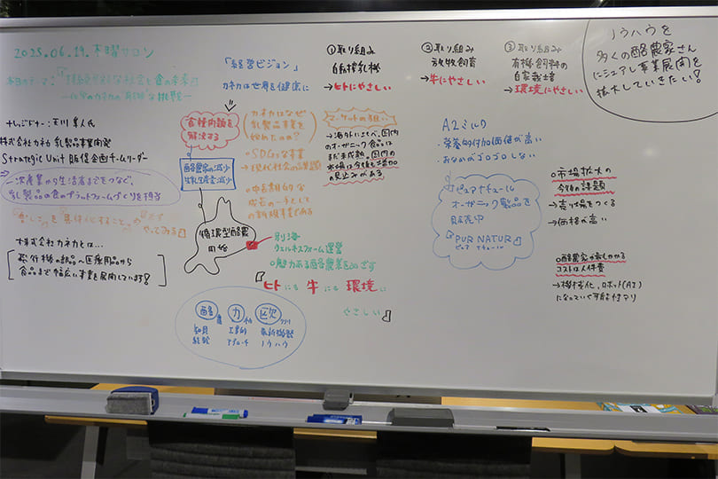 社会課題解決に向けた循環型有機酪農の拠点を開設し、誰にも優しい牧場を作ろうと取り組んでいて、「ヒトにも、牛にも、環境にもやさしい」が牧場のコンセプト。具体的な取り組みは、人的負担が大きい搾乳を自動搾乳機を導入することによって負担軽減することや、放牧飼育や快適な牛舎環境づくりに加え、牛の個体管理にも力を入れていること、農薬を使用せず大学と連携した有機飼料の自家栽培、自社ソーラー発電によるゼロエネファーム化など環境にやさしい取り組みをあげている。マーケット(ビジネス)として狙っていることは、オーガニック食品が少なすぎるため、どこでも買える状態に商品をそろた売り場作りをすると市場が伸びるのではないか、と考えているとお話された。