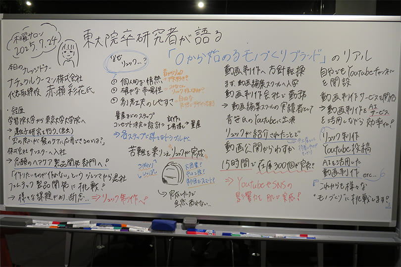 今回の木曜サロンでは、ナチュラルウーマン株式会社 代表取締役・赤瀬彩花氏をナレッジドナーに迎え、「東大院卒研究者が語る “0から始めるモノづくりブランド” のリアル」をテーマに講演いただいた。