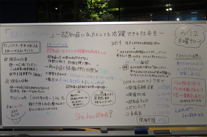 また、平井氏は親亡き後のつながりを作る「サリバンの会」の運営や、企業向け研修なども展開されているとのことで、正しさよりも楽しさを重視し、互いに貢献し合うことが生きる力になるとお話された。最後には、2024年に施行された認知症基本法にも触れ、企業との協働を通じて、認知症になっても本人が希望を持って自分らしく暮らせる「認知症にやさしい国」を実現したいと締めくくられた。