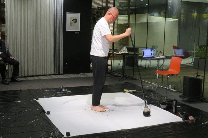 当日は、大型の半紙に墨汁を用い、リアルタイムで作品を制作。音楽およびナレーションを交えながら進行し、会場全体が一体となる演出のもと作品が完成。モチーフは「円(Ring)」とし、つながりや循環、境界といった概念をテーマに表現。制作過程を公開することで、完成作品のみならず、そのプロセス自体を共有する構成とした。