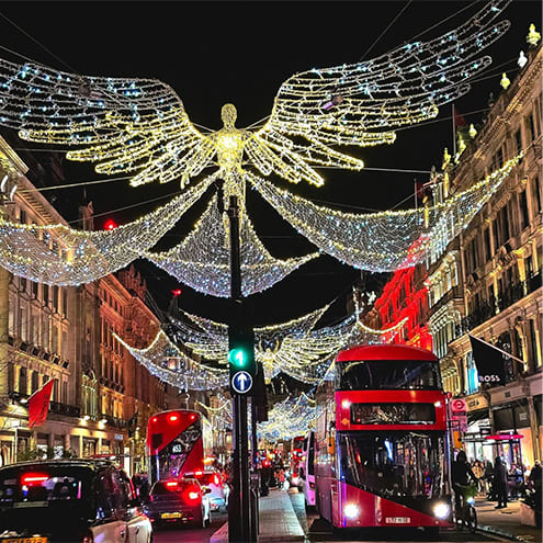 Its Christmas lights are famous worldwide for the giant illuminated angels that fly above passersby and this installation has become a symbol of London's Christmas lights.