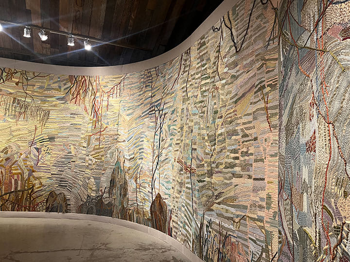 On display was a creation by French artist Eva Jospin, “Chambre de Soie” (Silk Room). It was fabulous, a plant and fantastical landscape image embroidered by the Chanakya Workshop in Mumbai, India, and the students at its school. The work, 3.5 meters tall and 107 meters long, couldn’t fit into one photo. It was embroidered with a variety of techniques, so even looking closely, you could see amazingly intricate details.