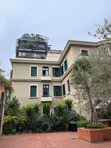 The area outside Casa Bradesco joins onto part of the Rosewood Hotel's garden, so I took a short walk to take a look. There was a neat grove of 150-year-old olive trees. Even though part of the hotel was still being renovated, the garden was well-maintained. I could also get a look at the back of the chapel. Actually, during the renovation, 30 meters of the ground below the chapel was excavated, and it was supported by eight large 60-meter pillars. That was because they were building a cinema and an event hall below the chapel. Isn’t the scale of these construction works incredible!