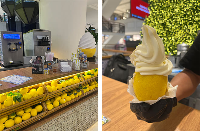 Amalfi is a parlor that has lemon-flavored ice cream. They also have milk-free sorbets. You can get it served in a lemon instead of a paper cup, which is so appealing and exciting. The flavor was so good and not too sweet. I think the sorbet might have a stronger lemon flavor. The topping has melted white chocolate, so it is sweet.