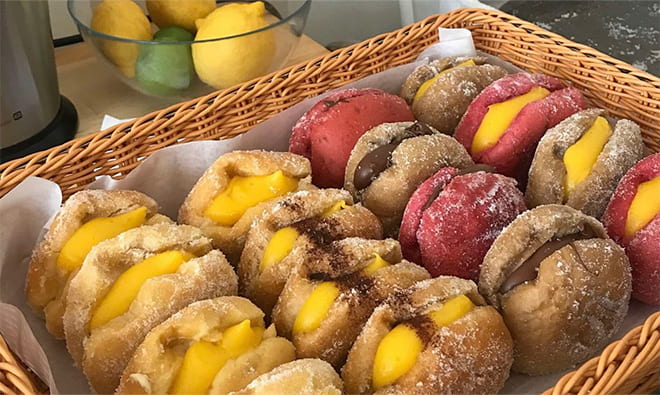 The variations only proliferated as the years went on, to the point where every shop now has its own unique flavors to enjoy—everything from chocolate, caramel, and strawberry to dulce de leche (milk jam), hazelnut, coconut, and lemon. Apparently, the original style made by Mrs. Davishon was a plain version stuffed with strawberry or another red berry jam. Looking further, I found that they still are made with jam in Germany, while other countries—among them Brazil, France, and Italy—all have their own flavors.