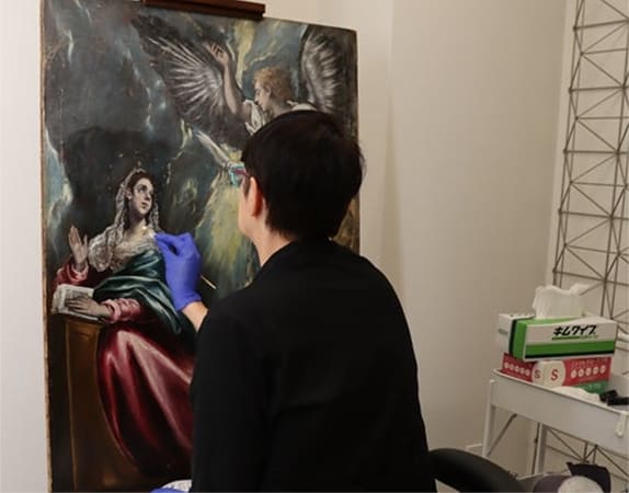 This is the headline of an article that was published the other day in the cultural section of the Spain-wide newspaper "ABC". “The Annunciation,” painted by the Greek artist El Greco (1541-1614), who created many masterpieces and spent his final years in the ancient capital of Toledo, Spain, has long fascinated visitors as the iconic image of the Ohara Museum of Art in Kurashiki City, Okayama. And after it was cleaned 66 years ago, on this occasion, a full-scale restoration was performed by Eva Martinez, a painting conservator commissioned by Madrid’s Prado Museum.